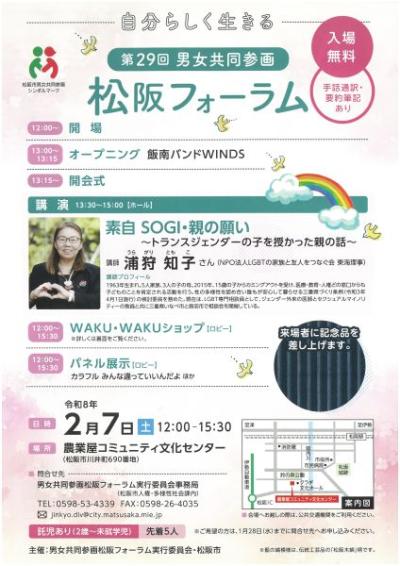 チラシコーナー公開日:2025年12月29日第29回男女共同参画 松阪フォーラム / 男女共同参画 松阪フォーラム実行委員会・松阪市松阪市市民活動センター -