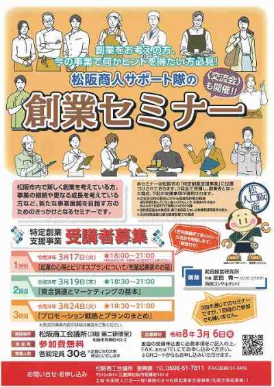 チラシコーナー公開日:2026年01月21日松阪商人サポート隊の創業セミナー/松阪商工会議所松阪市市民活動センター -