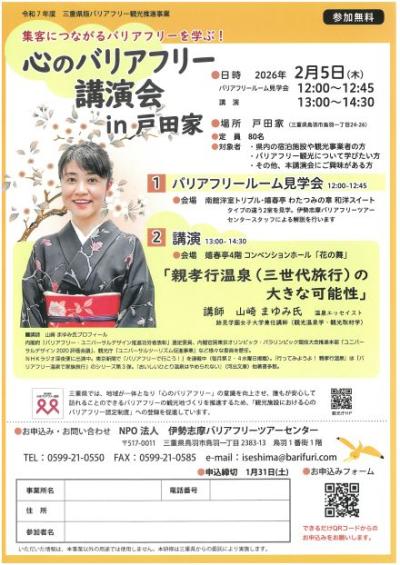 チラシコーナー公開日:2026年01月22日心のバリアフリー講演会in戸田家/NPO法人 伊勢志摩バリアフリーツアーセンター松阪市市民活動センター -