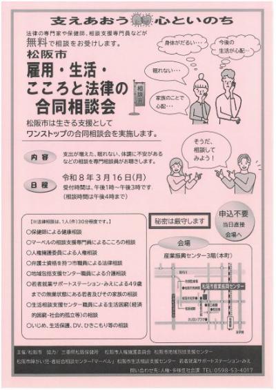 チラシコーナー公開日:2026年02月24日松阪市 雇用・生活・こころと法律の合同相談会/松阪市松阪市市民活動センター -