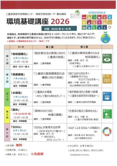 チラシコーナー公開日:2026年03月13日環境基礎講座2026(6~8月)/三重県環境学習情報センター松阪市市民活動センター -