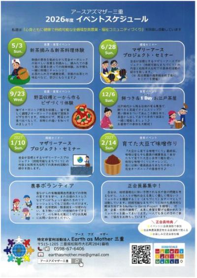 チラシコーナー公開日:2026年03月14日2026年度 イベントスケジュール/NPO法人 Earth as Mother 三重松阪市市民活動センター -