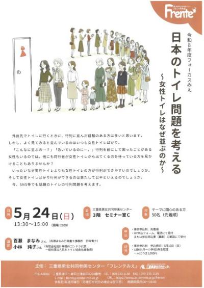 チラシコーナー公開日:2026年03月31日令和8年度フォーカスみえ 日本のトイレ問題を考える/三重県男女共同参画センター「フレンテみえ」松阪市市民活動センター -