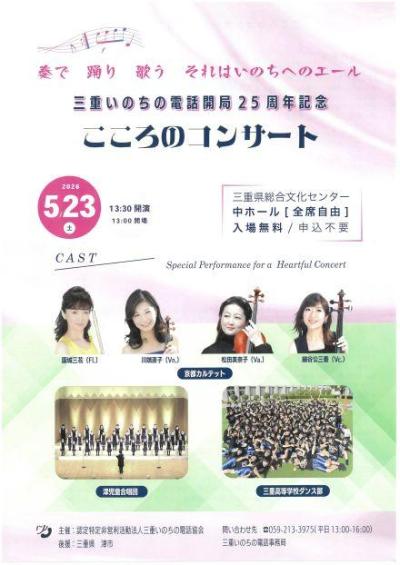 チラシコーナー公開日:2026年04月09日三重いのちの電話開局25周年記念 こころのコンサート/認定特定非営利活動法人三重いのちの電話協会松阪市市民活動センター -