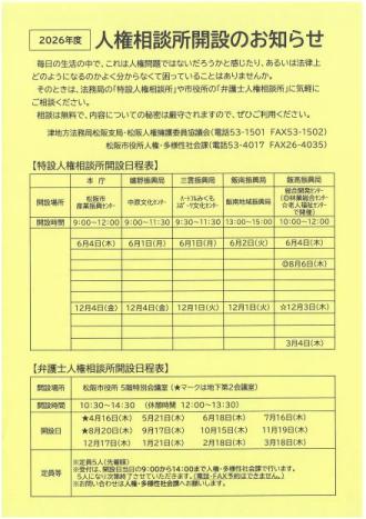 公開日:2026年03月26日2026年度 人権相談所開設のお知らせ/松阪市役所人権・多様性社会課松阪市市民活動センター -