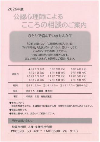 公開日:2026年03月26日公認心理師による こころの相談のご案内/松阪市役所 人権・多様性社会課松阪市市民活動センター -